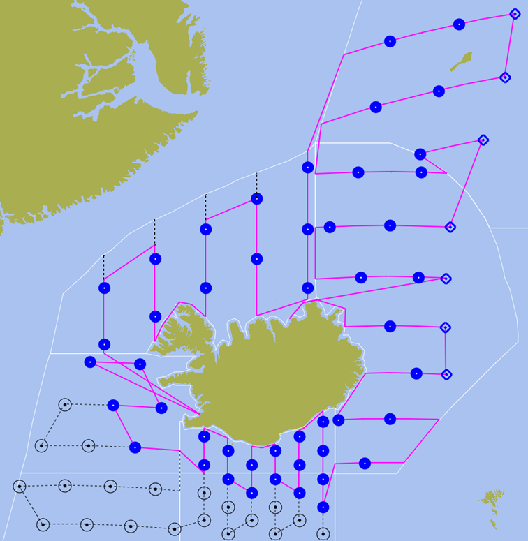 Mynd 1. Leiðarlína Árna Friðrikssonar (bleik lína) í uppsjávarrannsóknaleiðangri dagana 30. júní til 25. júlí 2025. Fylltir bláir hringir sýna fyrirfram ákveðnar yfirborðstogstöðvar og opnir bláir tíglar samskonar togstöðvar þar sem Árni mætir öðrum rannsóknaskipum. Ef vart er við makríl á suður- eða vesturmörkum leiðangurssvæðis eða síld fyrir norðan land þá verða leiðarlínur lengdar (svört lína og opinn svartur hringur).
