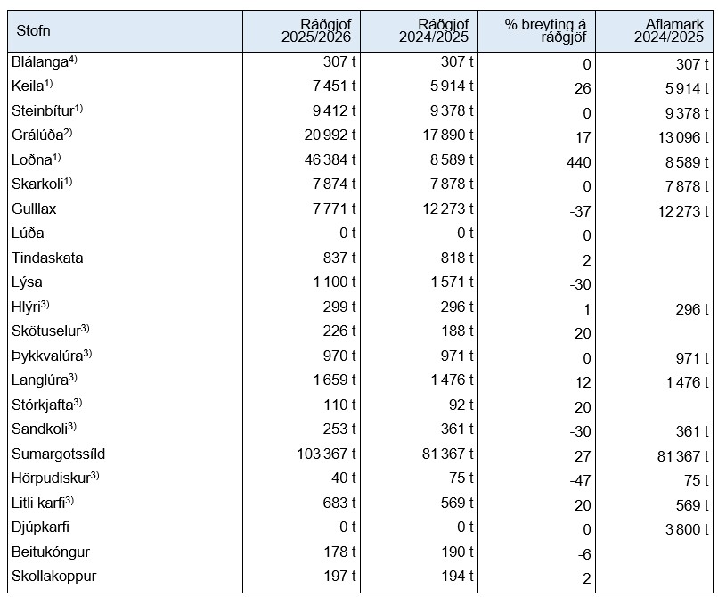 Tillögur um hámarksafla fiskveiðiárið 2025/2026, ásamt tillögum og aflamarki samkvæmt ákvörðun stjórnvalda fyrir fiskveiðiárið 2025/2025 (í tonnum). Einnig er sýnd hlutfallsleg (%) breyting á ráðgjöf milli fiskveiðiára.