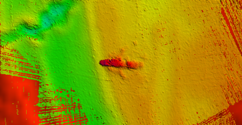 The ship's true dimensions may surpass the data's current estimates, the stern seems to be submerged beneath layers of sediment. Surrounding the wreck are scattered artifacts, likely remnants of the vessel itself.