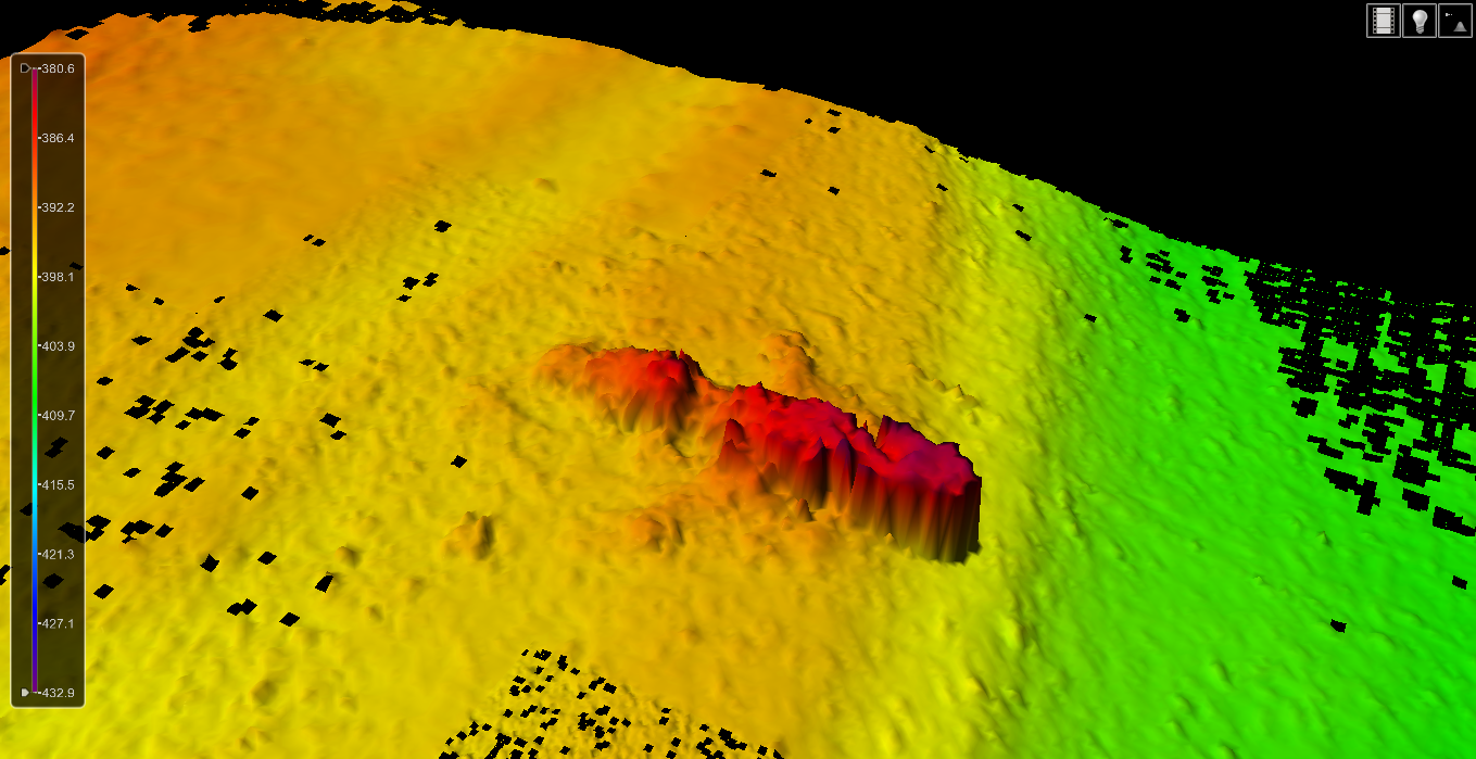About 80 nautical miles west of Snæfellsnes, at a depth of approximately 400 meters beneath the ocean's surface, rests a shipwreck. Its hull spans 155 meters in length and 20 meters in width, with what appears to be the bow rising 13 meters from the seabed, facing west. This intriguing discovery lies adjacent to the far edge of an iceberg ploughmark, stretching 330 meters in length and 12 meters deep.