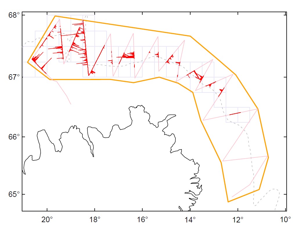 Figure 1. Árni Friðriksson tracks in the capelin survey 5-12 January 2026 (pink) along with acoustic values for capelin (red lines perpendicular to the survey tracks). The grey line shows the 400 m depth contour.