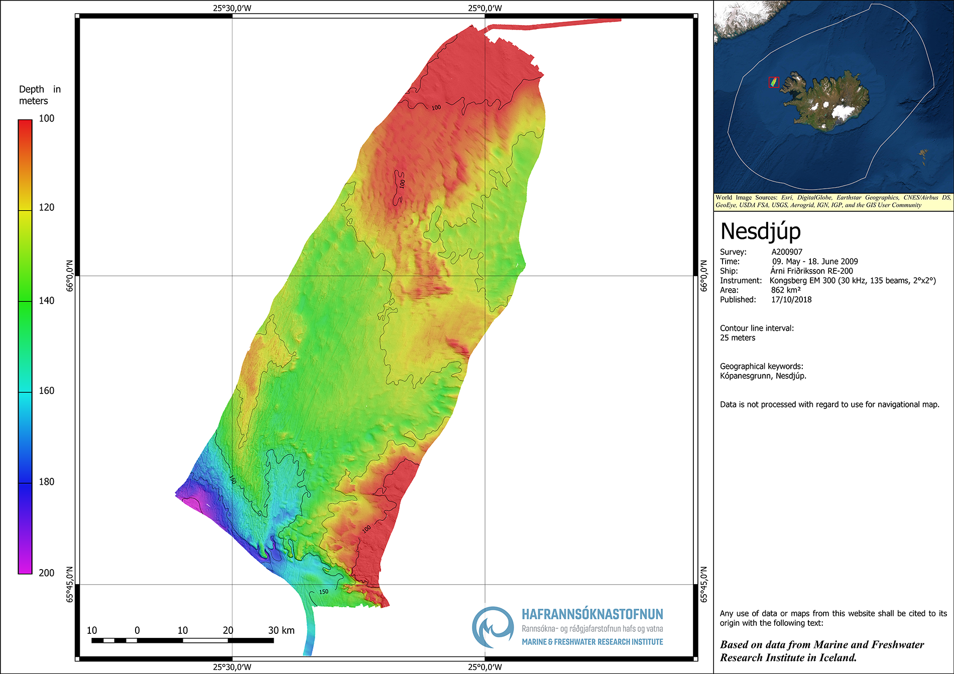 Post-processing: Raw data is processed and gridded in Caris HIPS & SIPS software with 20 x 20 m cell size in ISN2004 projection.