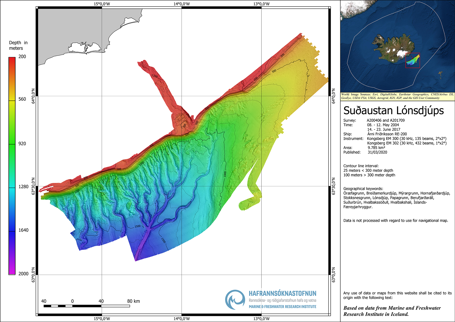 Post-processing: Raw data was processed and gridded in Caris HIPS & SIPS software with 20 x 20 m grid cell size in ISN2004 projection.
