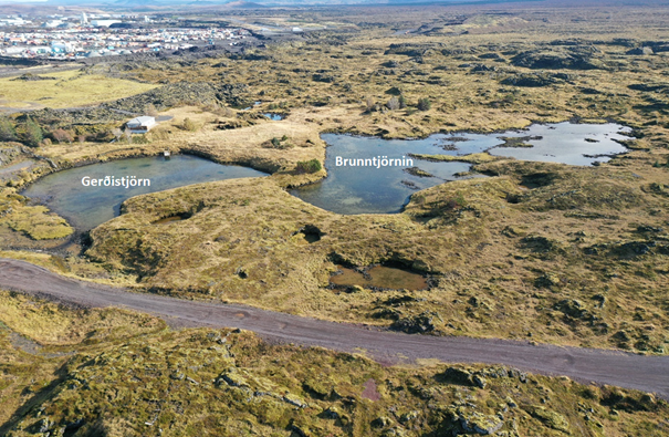 Yfirlitsmynd yfir Gerðistjörn og Brunntjörnina, sunnan við Reykjanesbraut (Ljósm. Ingi Rúnar Jónsson).