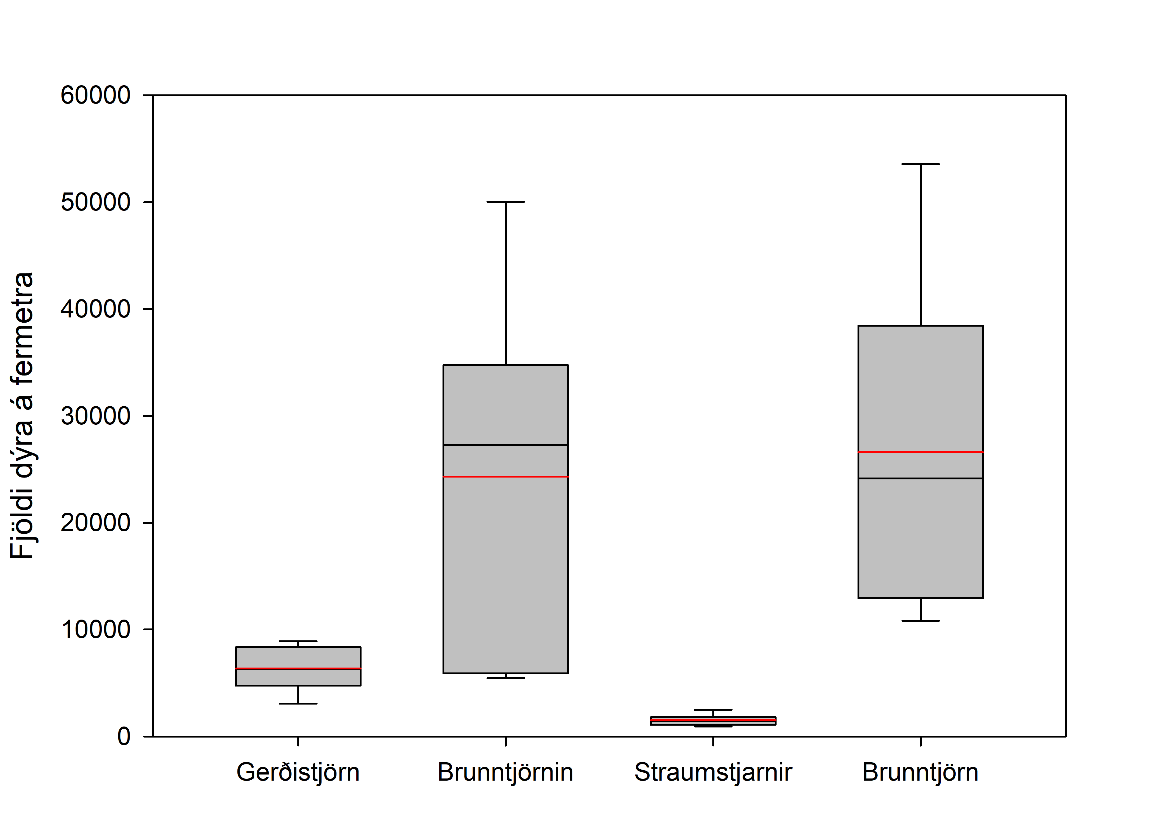 Fjöldi hryggleysingja í fjöru fjögurra tjarna við Straumsvík, 3. og 6. júlí 2020. Miðgildi er sýnt með svartri línu og meðaltal með rauðri láréttri línu í hverjum kassa. Lóðrétt lína sýnir neðri (5%) og efri (95%) mörk mælinga. Kassarnir sýna efri 75% og neðri 25% mörk mælinga.