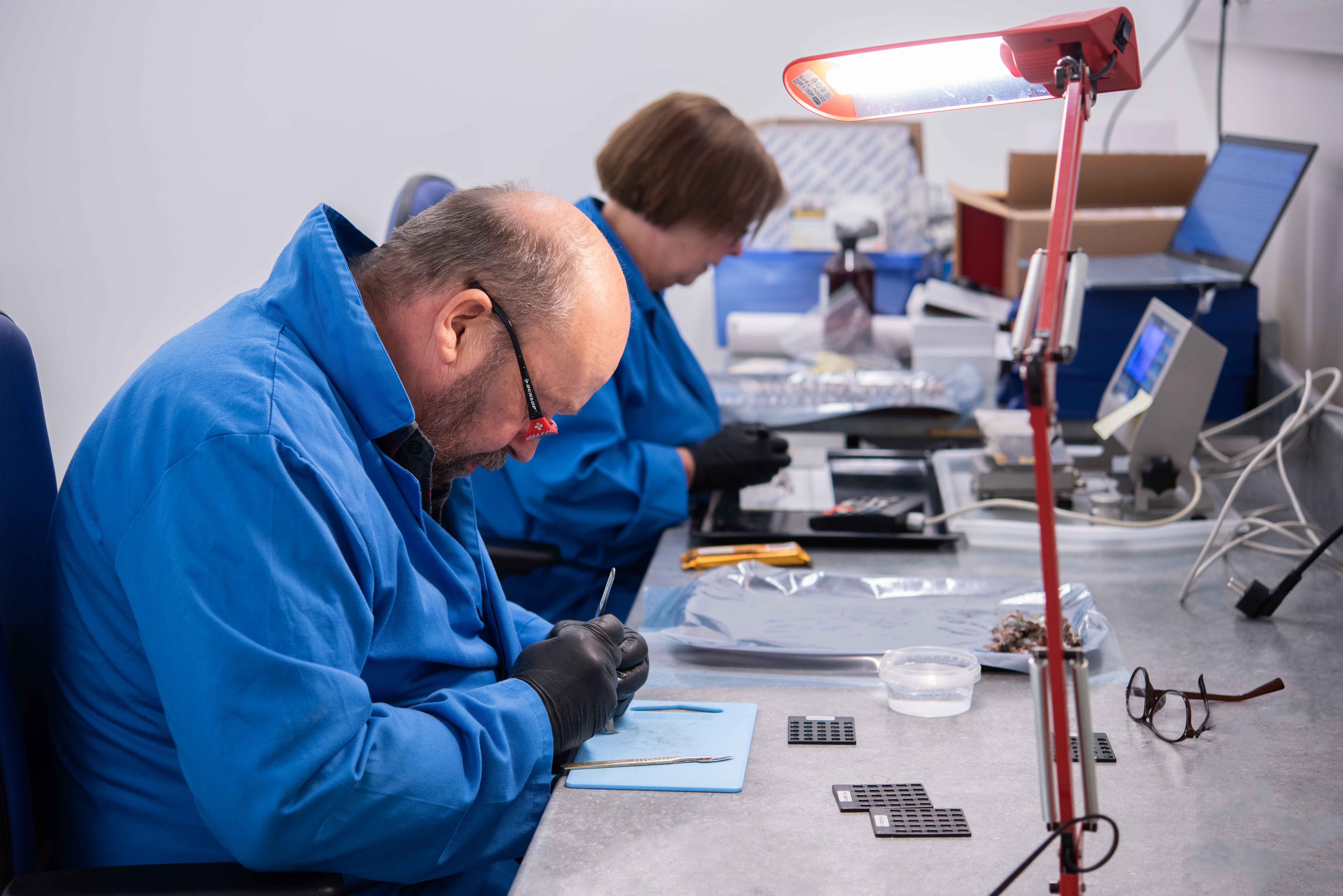 Starfsmenn við undirbúning kvarna til aldurslesningar.