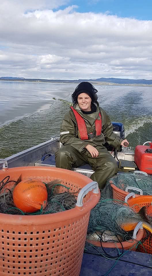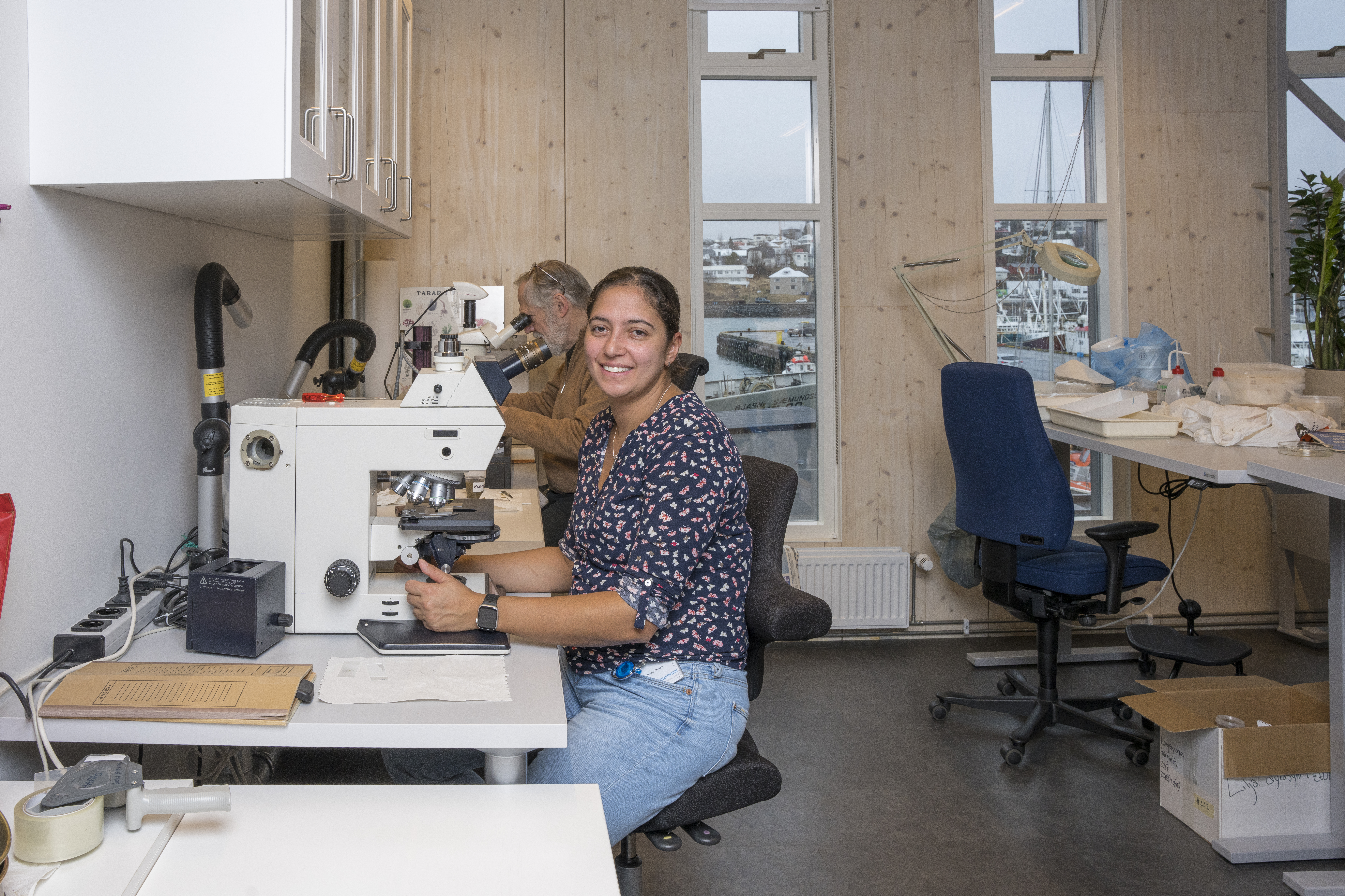 Á myndunum að neðan sést Thassya Christina dos Santos Schmidt fiskifræðingur við störf á rannsóknastofu Hafrannsóknastofnunar og Fjóla Rut Svavarsdóttir líffræðingur á góðum degi við rannsóknastörf í felti.