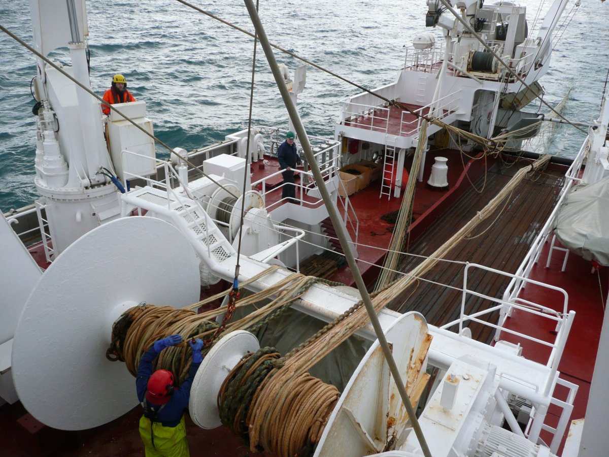 Jóhann, Guðmundur og Þorsteinn gera trollið klárt fyrir fyrstu stöð / Johann, Gudmundur and Thorsteinn prepare the pelagic trawl for the first station