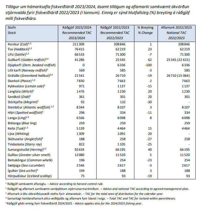 Hafrannsóknastofnun ráðleggur 1 % hækkun aflamarks þorsks fiskveiðiárið 2023/2024. Byggir sú ráðgjöf á aflareglu stjórnvalda. Því hækkar ráðlagður heildarafli úr 208 846 tonnum á yfirstandandi fiskveiðiári í 211 309 tonn. Hækkunina má rekja til hækkunar á mati á viðmiðunarstofni í ár. Gert er ráð fyrir að viðmiðunarstofn þorsks fari hægt vaxandi næstu tvö til þrjú ár þegar árgangarnir frá 2019 og 2020 koma að fullu inn í viðmiðunarstofninn þar sem þeir eru nú metnir yfir meðallagi.