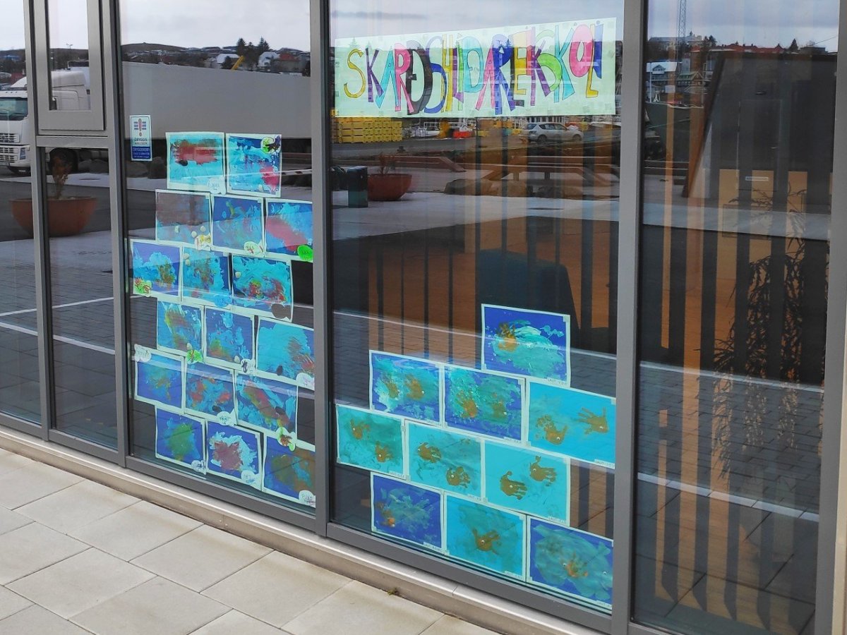 Þessa dagana standa yfir Bjartir dagar í Hafnarfirði. Hátíðin er lágstemd vegna Covid en þó eitt og annað gert til þess að gera sér dagamun. Hérna á Hafrannsóknastofnun hefur Skarðshlíðarleikskóli sem staðsettur er á Völlunum, fengið leyfi til þess að hengja listaverk barnanna í glugga á neðstu hæðinni. Myndirnar snúa út og því hægt að ganga með húsinu og skoða sýninguna utan frá.