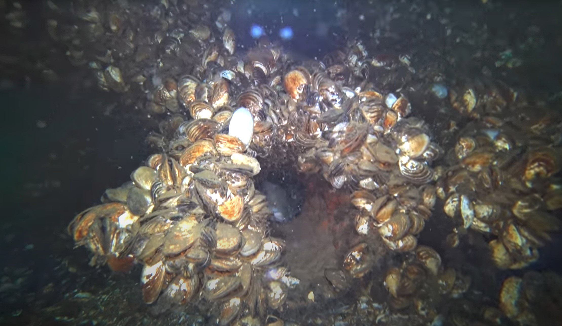 Á þessari mynd af botni Lake Ontario má sjá ferskvatnsskeljar (Zebra mussels) en myndin var klippt úr myndbandi