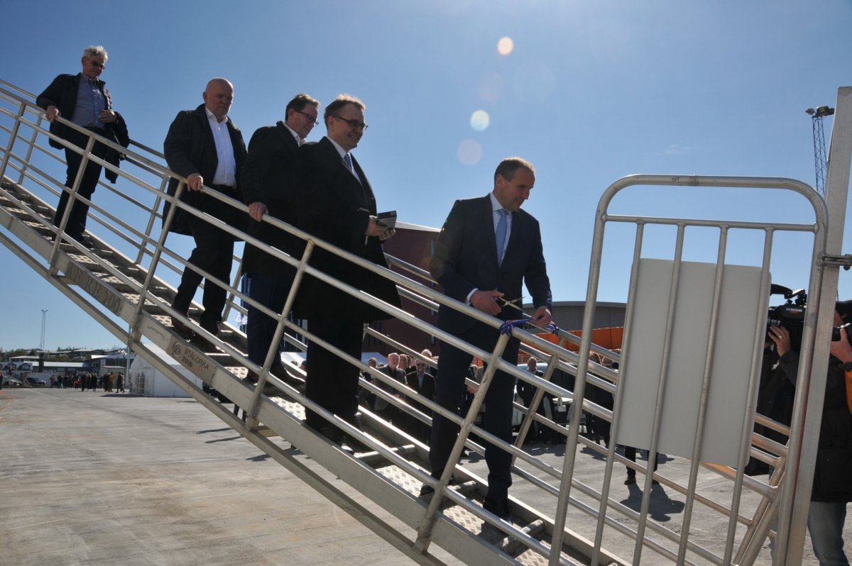 Forseti Íslands Guðni Th. Jóhannesson var með í för og klippti á borða þegar komið var að bryggju við Fornubúðir 5. Þar með er Hafrannsóknastofnun formlega flutt í Hafnarfjörð.