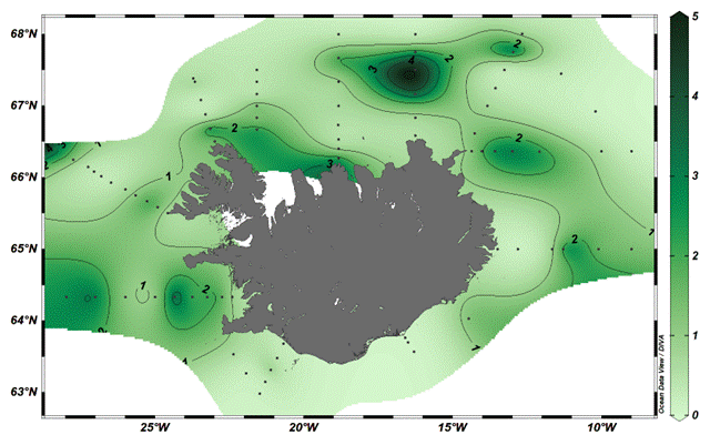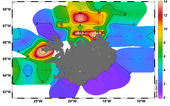 Rannsóknaskipið Bjarni Sæmundsson var í leiðangri til rannsókna á ástandi sjávar, næringarefnum, plöntusvifi og dýrasvifi á miðunum umhverfis landið 15. - 26. maí síðastliðinn.