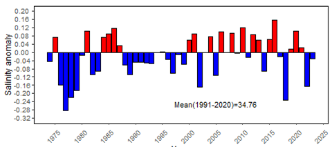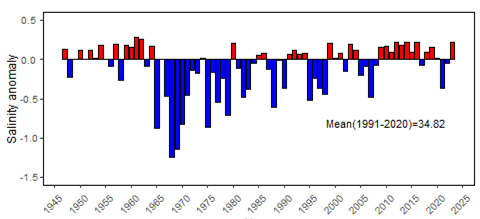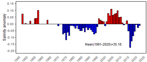 Seltan var nálægt meðaltali viðmiðunartímabilsins. Seltan hefur farið vaxandi undanfarin ár frá því lágmarki sem mældist árið 2017. Þetta bendir til að hlýsjórinn að sunnan hafi verið með svipuðum eiginleikum og undanfarin ár.