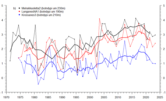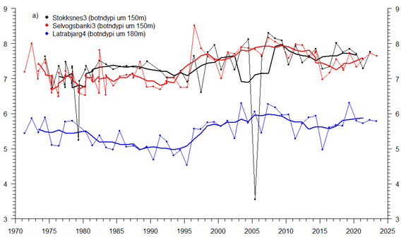 Mælingarnar frá stöðvunum sunnanlands og vestan (mynd 5 a) sýna að hiti yfir botni hefur haldist hár þar síðustu tvo áratugi. Hiti við botn á þessum slóðum á árunum 2021-2023 var hár. Botnhiti á landgrunninu norðan lands og austan hefur farið lækkandi undandafarin ár (mynd 5 b).