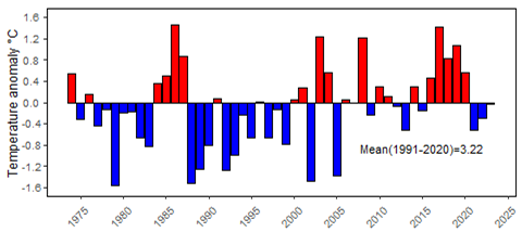 Mynd 3. Frávik meðalhita og meðalseltu í efstu 50 metrum sjávar á stöðvum 2-4 á Siglunesi frá meðaltali áranna 1991-2020.
