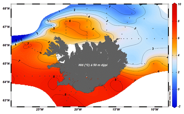 Innflæði hlýsjávarins norður fyrir land var töluvert meira en í fyrra en það sést vel á mynd 1 sem sýnir sjávarhita á 50 metra dýpi.