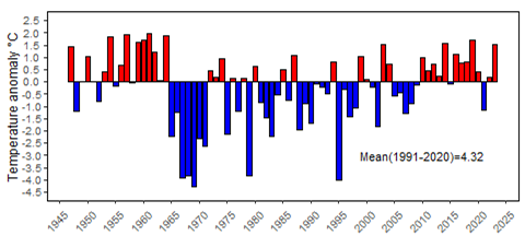 Sjávarhiti (mynd 2) í efstu 50 metrum sjávar í hlýsjónum úti fyrir Suður- og Vesturlandi var á bilinu 7,9-8,3°C, Það er lítillega undir hita viðmiðunartímabilsins 1991-2020 en þrálátar lægðir í vor hafa viðhaldið lóðréttri blöndun sjávarins sem hægir á hlýnun yfirborðslagsins.