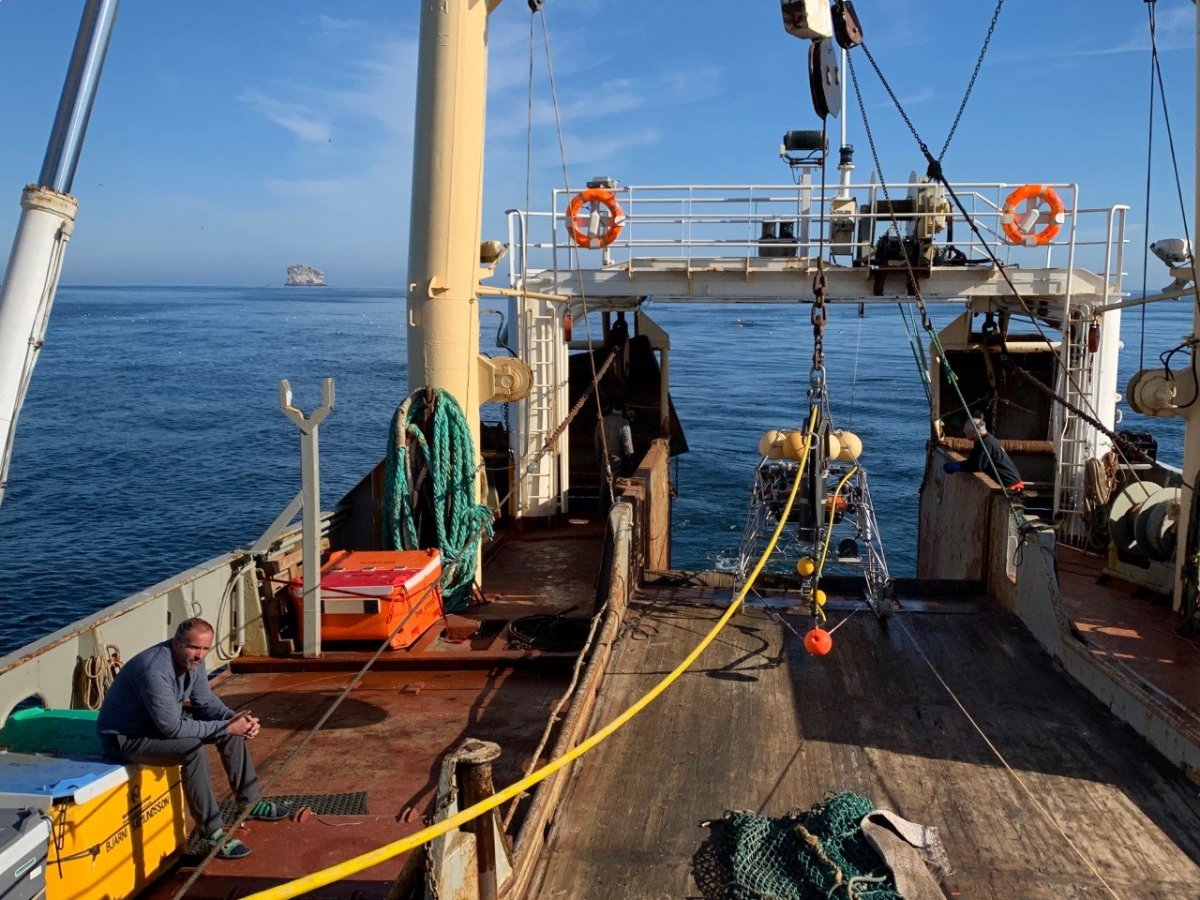 Myndin er tekið á humarslóð suður af Eldey. Hjalti Karlsson útibússjóri á Ísafirði sést á mynd og myndatökusleði sem notaður er við rannsóknina er við skutrennu. Ljósm. Jónas P. Jónasson