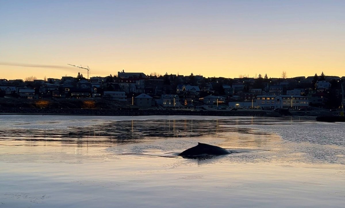 Á myndinni má sjá hnúfubak dóla sér í höfninni, en hnúfubakur er sú hvalategund sem jafnan vekur mestu athygli meðal almennings einkum sökum atferli síns. Sjá nánar um hnúfubaka hér.