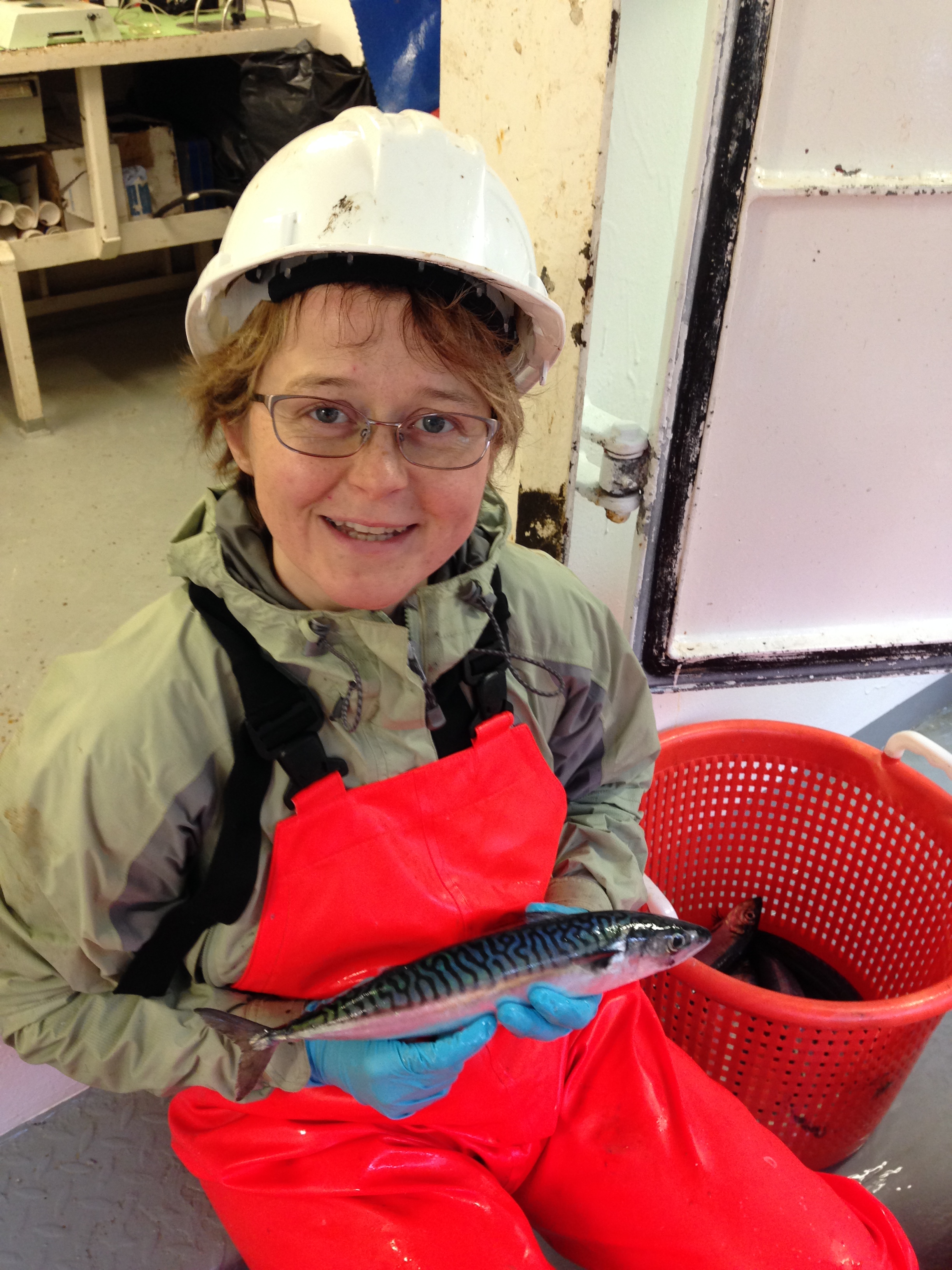 Anna Heiða hefur starfað sem fiskifræðingur hjá Hafrannsóknastofnun frá árinu 2015. Hún vinnur á uppsjávarsviði við rannsóknir á vistfræði makríls og kolmunna og tekur þátt í stofnmati fyrir þessa stofna innan vébanda Alþjóðlega Hafrannsóknaráðsins. Á myndinni má sjá Önnu Heiðu í einum af sínum fyrstu makrílleiðangrum, í þetta sinn í Færeyjum.