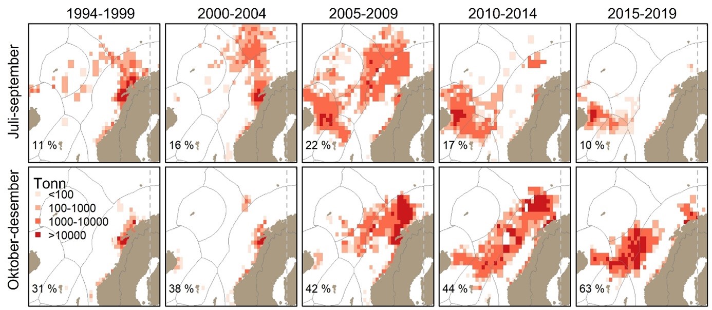 Mynd 2. Dreifing norsk-íslenskrar síldar samkvæmt afladagbókum íslenskra, færeyskra og norskra fiskiskipa á fimm ára tímabilum í júlí-september (efri myndir) og október-desember (neðri). Prósentan gefur hlutfall afla á ársgrundvelli sem tekið var á viðkomandi tímabili.