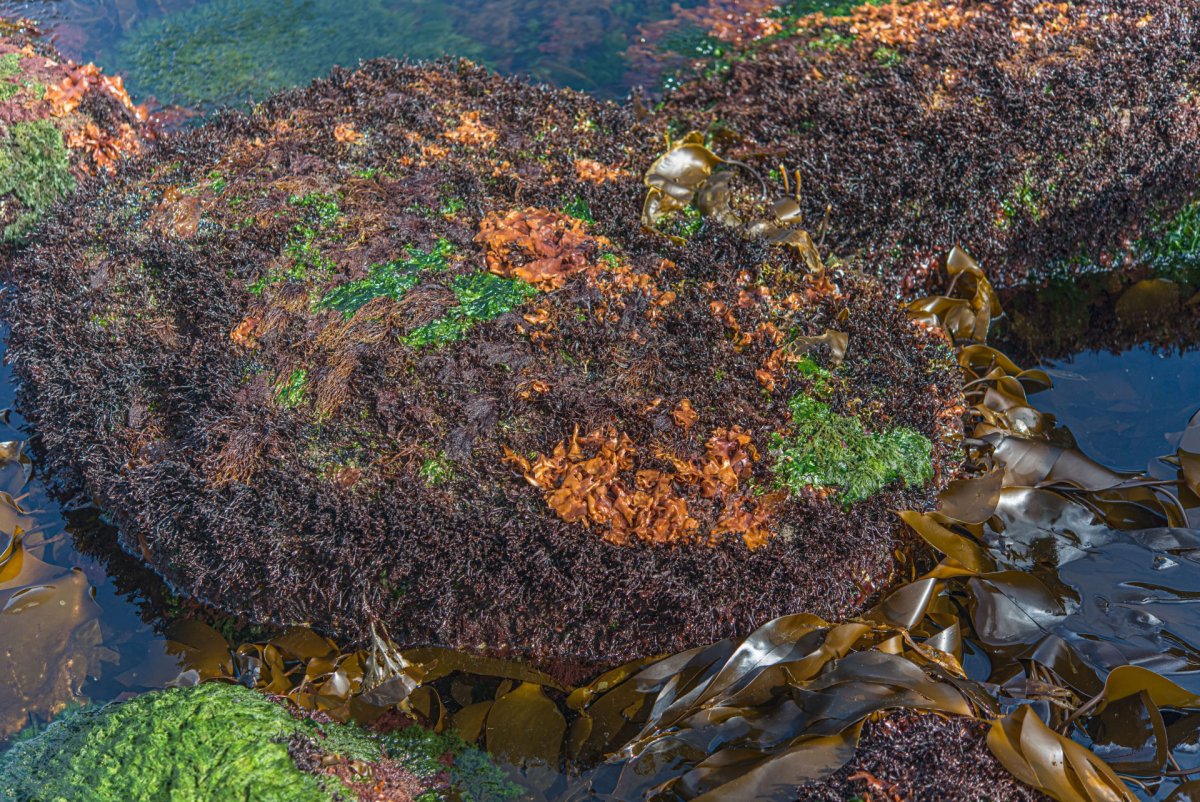 Flekkir af rauðleitri klóblöðku neðan til í fjörunni á utanverðum Reykjanesskaga. Ljósmynd: Karl Gun… Flekkir af rauðleitri klóblöðku neðan til í fjörunni á utanverðum Reykjanesskaga. Ljósmynd: Karl Gunnarsson.