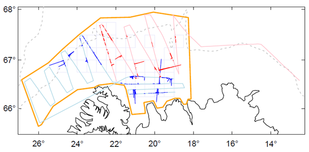 Leiðarlínur Polar Ammassak (bleik) og Aðalsteins Jónssonar (blá) dagana 24. febrúar til 1. mars 2025 norðvestur af Íslandi og dreifing loðnu (lengd þverlína á siglingastefnu skipanna sýnir þéttleikann).