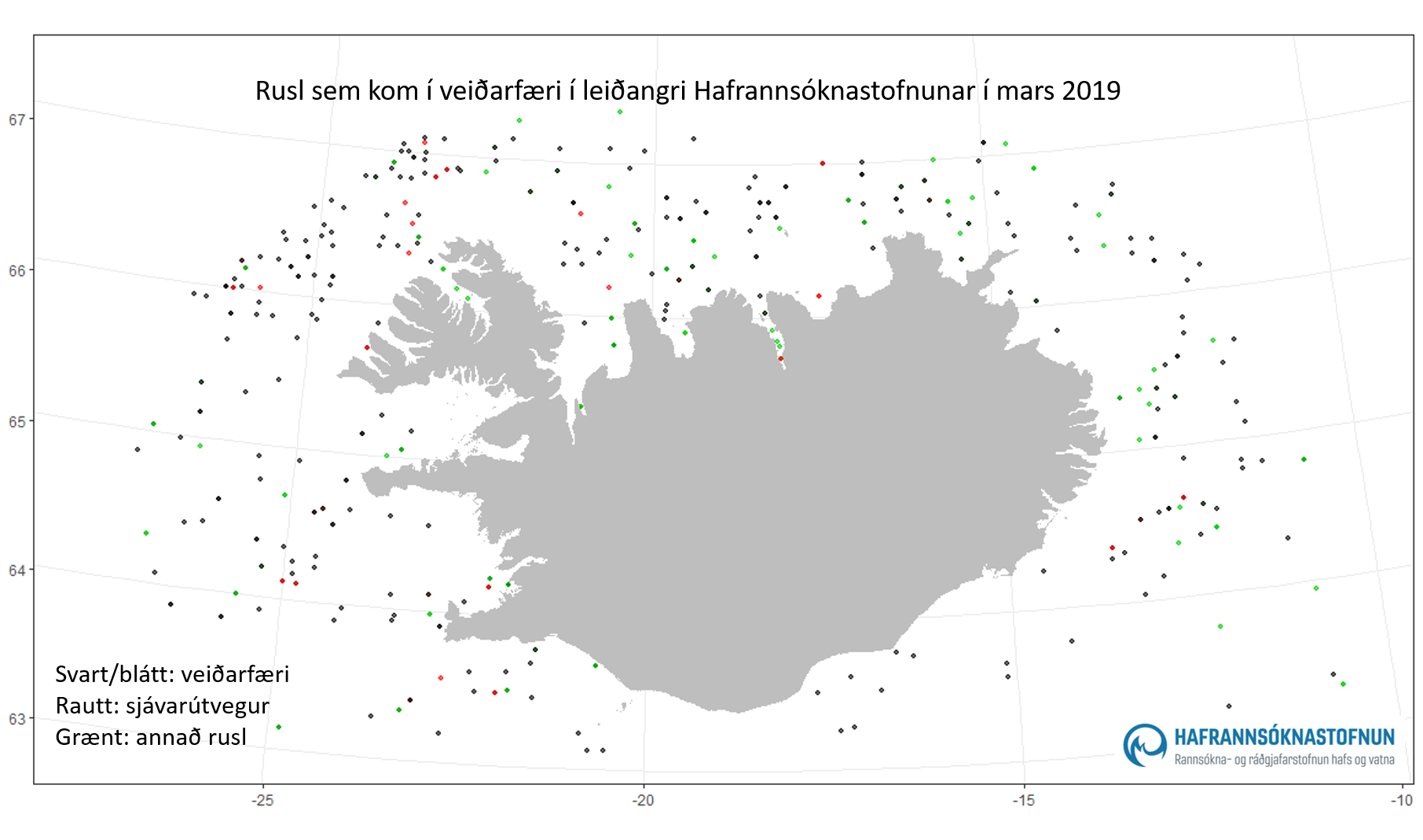 Hafrannsóknastofnun hefur á undanförnum árum skráð kerfisbundið magn sjáanlegs plasts sem kemur í veiðarfæri í leiðöngrum stofnunarinnar. Mikilvægt er að geta greint uppruna plastsins til að hægt sé að beina sjónum í rétta átt þegar kemur að því að fyrirbyggja að plast berist í hafið. Megnið af því plasti sem kemur í veiðarfæri í leiðöngrum stofnunarinnar er tengt sjávarútvegi. Algengast er að finna spotta af ýmsu tagi og netadræsur (blátt og svart á myndinni) en einnig alls kyns brot úr fiskikörum og slíku (rautt á myndinni). Rusl af öðrum uppruna en sjávarútvegi (grænt) kom í minna mæli í veiðarfæri en var í þó nokkrum þéttleika á sumum stöðum.