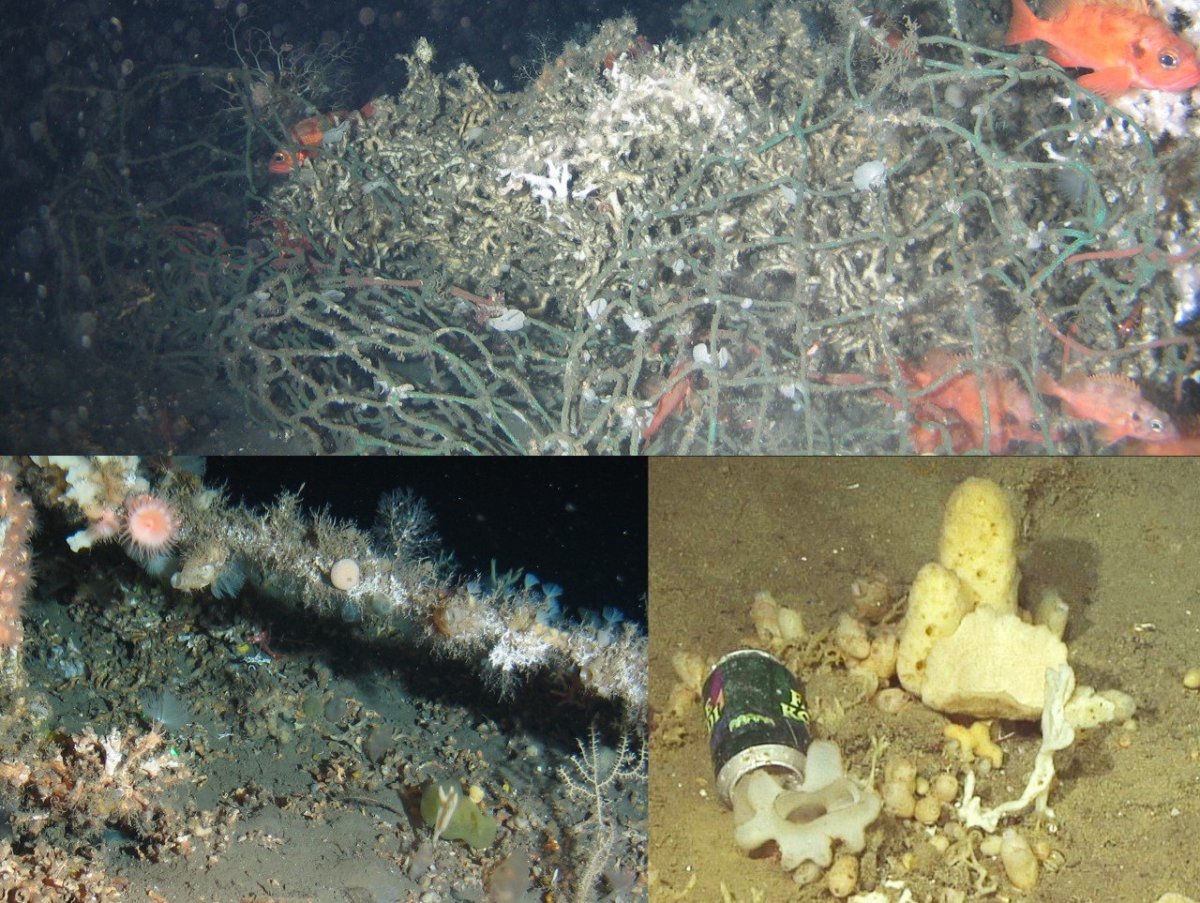 Dæmi um rusl sem fannst. Efst er trollnet sem fannst í Skeiðarárdjúpi árið 2019 flækt við kóralrif á 243 metra dýpi. Niðri til vinstri er fiskilína sem fannst á kóralsvæði í Háfadjúpi árið 2012 þakin möttuldýrum, hveldýrum, mosadýrum, svömpum, sæfíflum og burstaormum. Niðri til hægri má sjá Faxe Condi dós sem liggur meðal svampa og möttuldýra í Jökuldjúpi á 220 m dýpi.