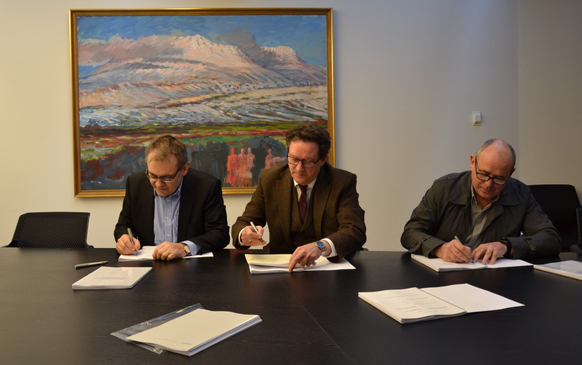 Sigurður Guðjónsson, Kristján Þór Júlíusson og Jón Rúnar Halldórsson undirrita samning um nýtt húsnæði Hafrannsóknastofnunar.