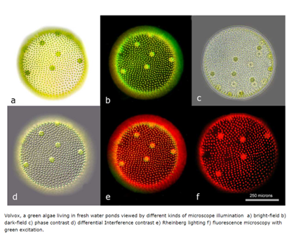 Dæmi um mismunandi ljósstýringu og ljóssíun. a) hefðbundin lýsing, ”bright-field”, b) svartur bakgrunnur, ”dark-field”, c) fasakontrast (Phase Contrast), d) DIC (Differential Interference Contrast, e) Rheinberg lýsing og f) flúrljómun.