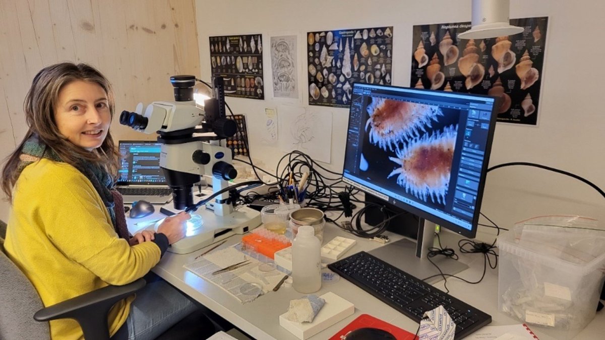 Laure de Montety sjávarlíffræðingur við splunkunýja Olympus SZX16 víðsjá. Laure de Montety sjávarlíffræðingur við splunkunýja Olympus SZX16 víðsjá.