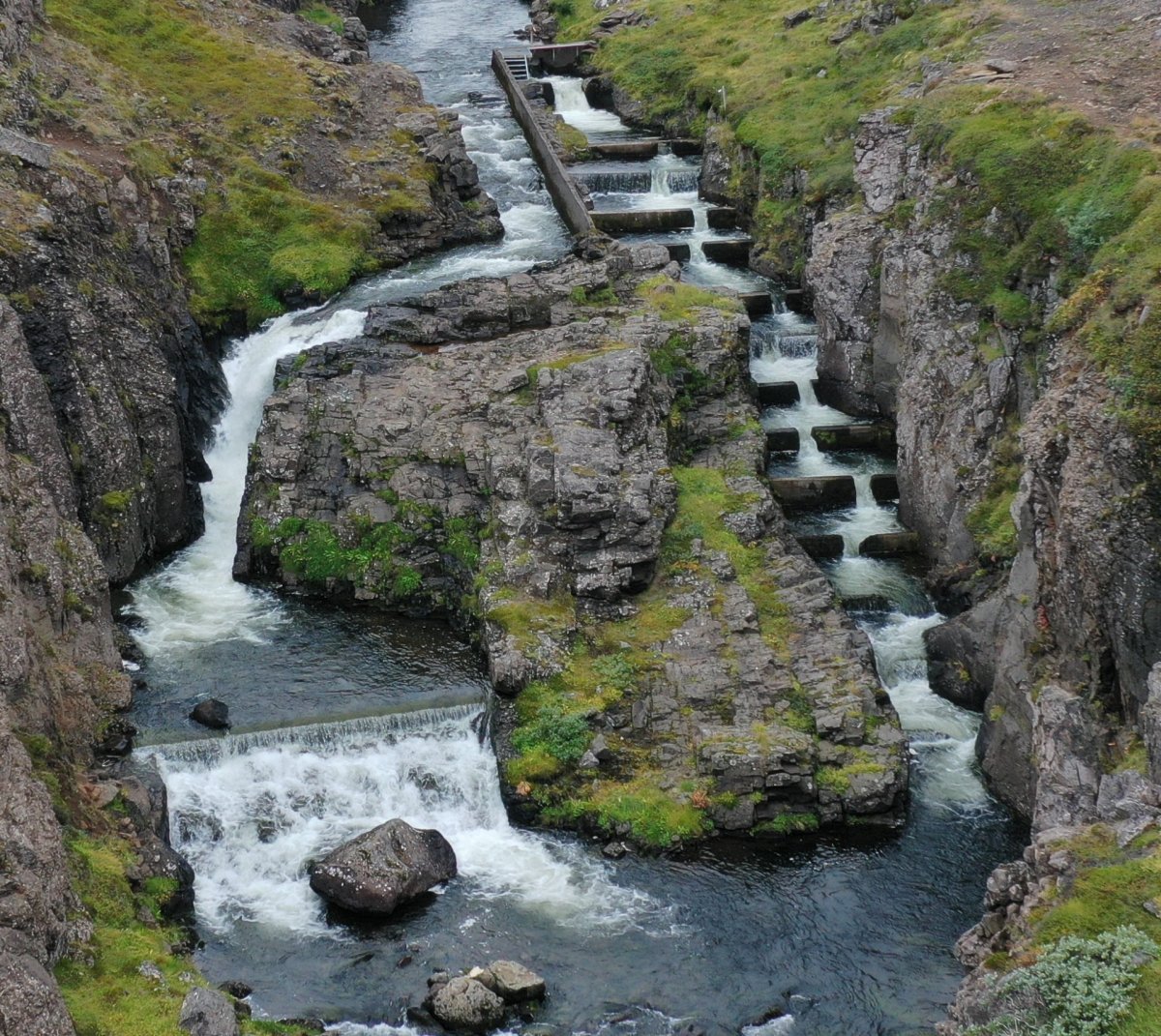 Mynd tekin úr dróna af laxastiga í Laugardalsá.