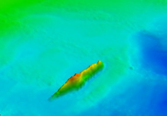 Myndin sýnir 230 m háan og 7.5 km langan berggang á 2.500 m dýpi.