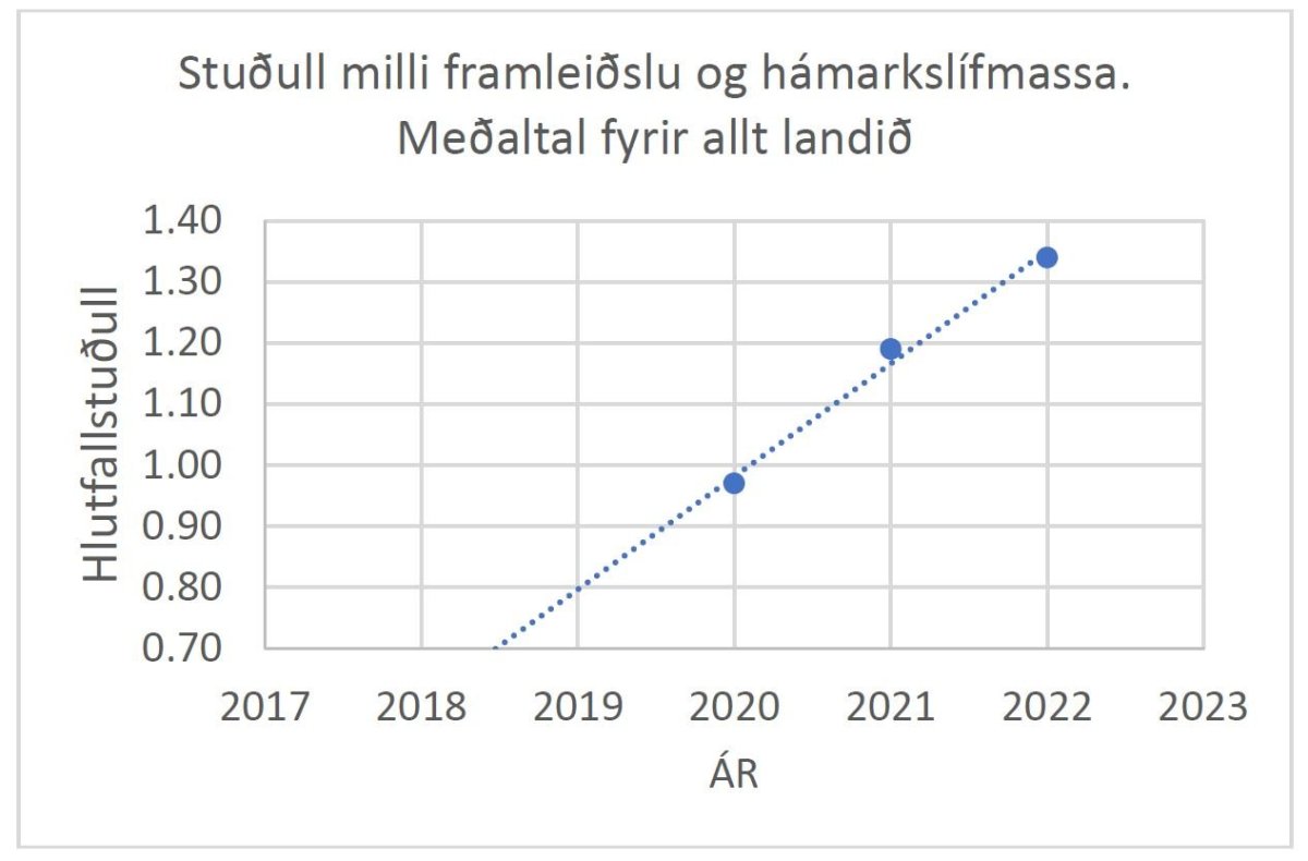 Síðla árs 2020, eftir að áhættumatsskýrslan var gefin út, opnaði vefsíðan Mælaborð fiskeldis. Þar var í fyrsta sinn hægt að nálgast raungögn úr sjókvíaeldi á laxi, bæði hvað varðar áætlaðan lífmassa og skráðar framleiðslutölur. Nú er hægt að reikna út hvernig framleiðslustuðullinn hefur verið á þeim tíma sem gögn liggja fyrir. Þá kemur í ljós að hlutfall framleiðslu og lífmassa hefur farið hækkandi með línulegum hætti í nokkur ár. Stuðullinn fyrir allt landið var 0,97 árið 2020 en hefur síðan hækkað upp í 1,33 á árinu 2022, eins og sjá má á meðfylgjandi mynd. Ef gert er ráð fyrir línulegri hækkun frá árinu 2019, en það er lokaár viðmiðunarmatsins 2020, má áætla að gildið hafi einmitt verið nálægt 0,8 á árinu 2019, eða sama tala og notuð var. Hækkun framleiðslustuðulsins endurspeglar væntanlega þær stöðugu framfarir sem hafa sér stað í eldisárangri hjá eldisfyrirtækjum á undanförnum árum. Svo virðist sem afföll séu minni og vöxtur betri en reiknað var með í upphafi. Einnig geta neyðarslátranir vegna sjúkdóma haft nokkuð að segja með því að draga úr sláturstærð og hækka þannig stuðulinn.