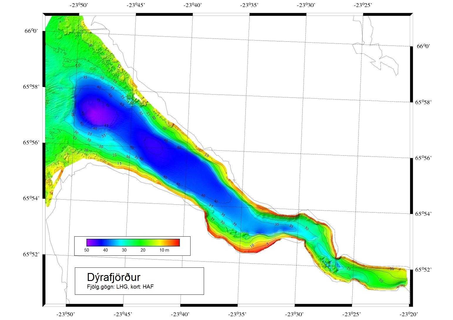 Gert hefur verið botnkort af Dýrafirði með svokölluðum fjölgeislamæli (mynd neðar). Fram kemur að í mynni fjarðarins er mun grynnra (30 m) en er kemur inn í fjörðinn. Með ströndum beggja vegna fjarðarinns er lítið grunn þar sem dýpi er allt að 30 m en síðan dýpkar hratt ofan í miðfjörðinn þar sem dýpi er rúmlega 40 m nema rétt innan við mynni fjarðarins þar sem dýpi er mest rúmlega 45 m. Innri hluti fjarðarins þ.e. innan við Þingeyri er grunnur þ.e. minna en 30 m djúpur en síðan grynnkar enn meira er innar dregur og er dýpi i innsta hlutanum 10 til 20 m. Á móts við Þingeyri virðist vera lágur þröskuldur þvert yfir fjörðinn og á fjölgeislakortinu er einnig að sjá hraun eða hóla innan við Þingeyri sunnan megin í firðinum og í framhaldi af þeim lágan þröskuld yfir fjörðinn.