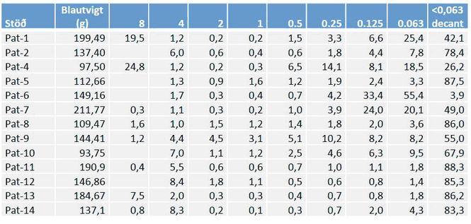 Mælingar á kornastærð sýndu að mjög fínt set <0,063 (decant) var ríkjandi á flestum stöðvunum í Patreksfirði. Yfir 55% leir var á alls níu stöðvum í firðinum. Sandur (0,063-2 mm) var ríkjandi á stöðvum 6 og 4 (94,4 og 47,8%). Jafnt hlutfall sands og leirs var á stöð 7 í firðinum.