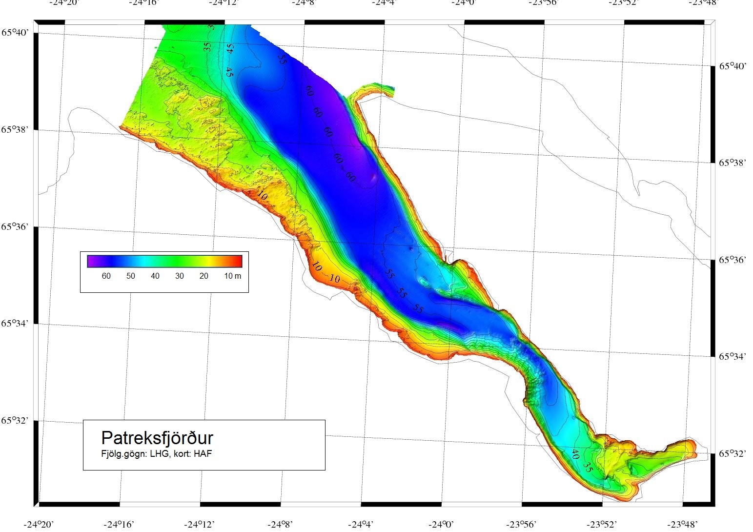Gert hefur verið botnkort af Patreksfirði með fjölgeislamæli (sjá mynd). Fram kemur að sunnan megin í firðinum er grunn ræma en síðan dýpkar mjög hratt niður í fjörðinn þar sem er 50-70 m dýpi. Norðan megin í firðinum eru nánast ekkert grunn nema á stöku stað. Þegar innar dregur í fjörðinn grynnkar og fyrir botni hans þar sem heitir Ósafjörður er grunnur þröskuldur en aðeins dýpra þar fyrir innan þó grunnt sé.