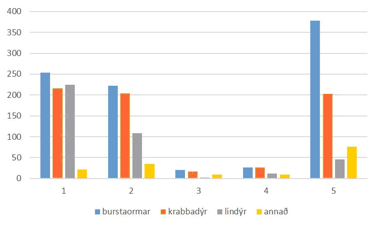 Úrvinnsla hefur farið fram á stöðvum 1-5 (tafla 2). Alls hafa verið greindar 96 tegundir/hópar frá þessum stöðvum. Þessi dýr tilheyrðu að mestu fylkingum burstorma, krabbadýra og lindýra (2. mynd). Afar fáar tegundir tilheyrðu öðrum hópum og meðal annars voru skrápdýr einungis greind í þrjár tegundir slöngustjarna og flest dýr sem tilheyrðu lindýrum voru samlokur.