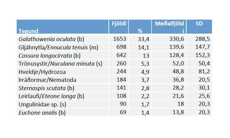 Í töflunni hér neðar má sjá hlutfall tíu algengustu tegunda/hópa í Tálknafirði. Þar kemur einnig fram heildarfjöldi dýra á fimm stöðvum og hlutfall þeirra af heild, meðalfjöldi og staðalfrávik. Tegundir sem tilheyra hóp burstaorma eru einkenndir með (b), þær sem tilheyra samlokum eru einkenndar með (s) og krabbadýr með (k).
