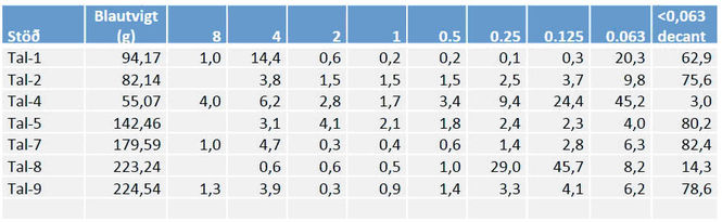 Mælingar á kornastærð (sjá töflu 1) sýndu að mjög fínt set <0,063 (decant) var ríkjandi á flestum stöðvunum. Yfir 55% leir var á fimm stöðvum í firðinum. Sandur (0,063-2 mm) var ríkjandi á stöðvum 4 og 8 (86,9 og 85,1%).