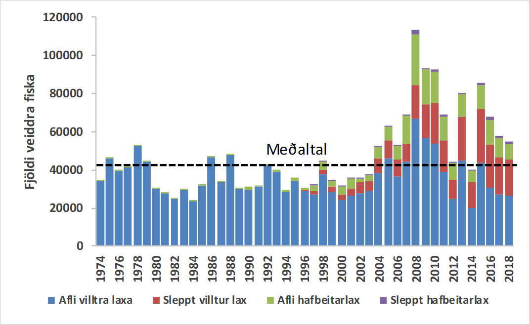 Laxveiðitímabilinu er nú lokið í flestum ám landsins. Enn er þó veitt í ám þar sem uppistaðan í veiðinni er lax úr sleppingum gönguseiða, en þar stendur veiði til 20. október. Bráðabirgðatölur yfir stangveiði á laxi sýna að alls veiddust um 46.000 laxar (1. mynd) sem er um 9% yfir langtímameðaltali áranna 1974-2017. Veiðin 2018 var um 650 löxum minni en hún var 2017. Í tölum um heildarlaxveiði eru taldir villtir laxar, laxar sem upprunnir eru úr sleppingum gönguseiða og einnig þeir laxar sem er sleppt aftur í stangveiði (veitt og sleppt).