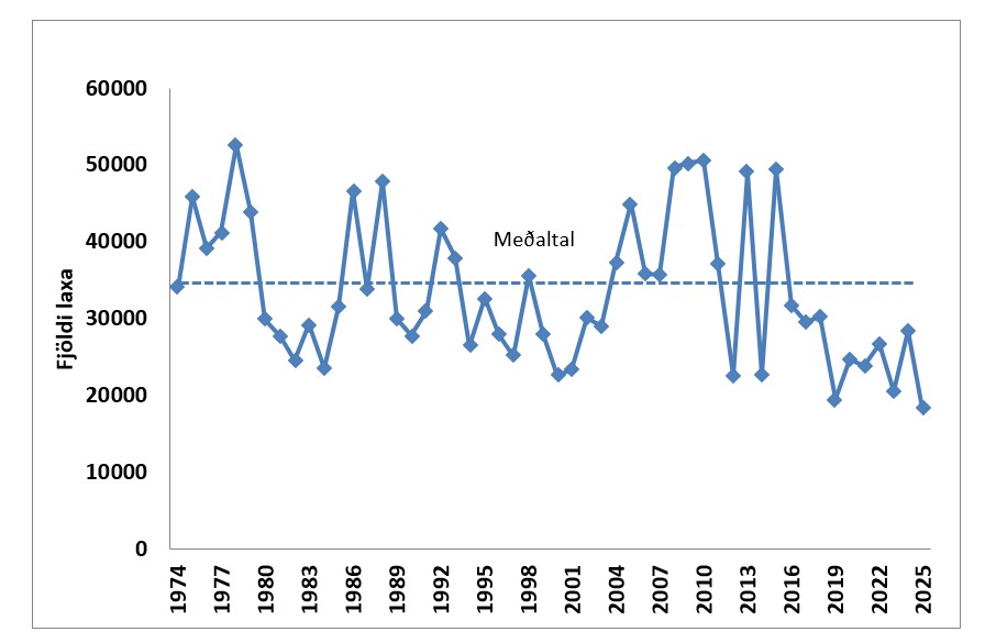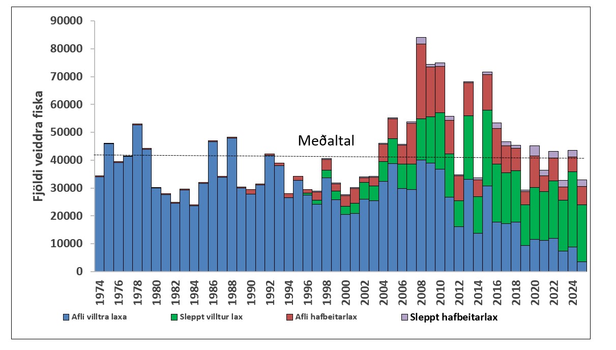 Heildarfjöldi stangveiddra laxa árið 2025 var um 33.000 fiskar sem er um 24 % minni veiði en var á árinu 2024 og um 20% undir árlegri meðalveiði frá 1974.