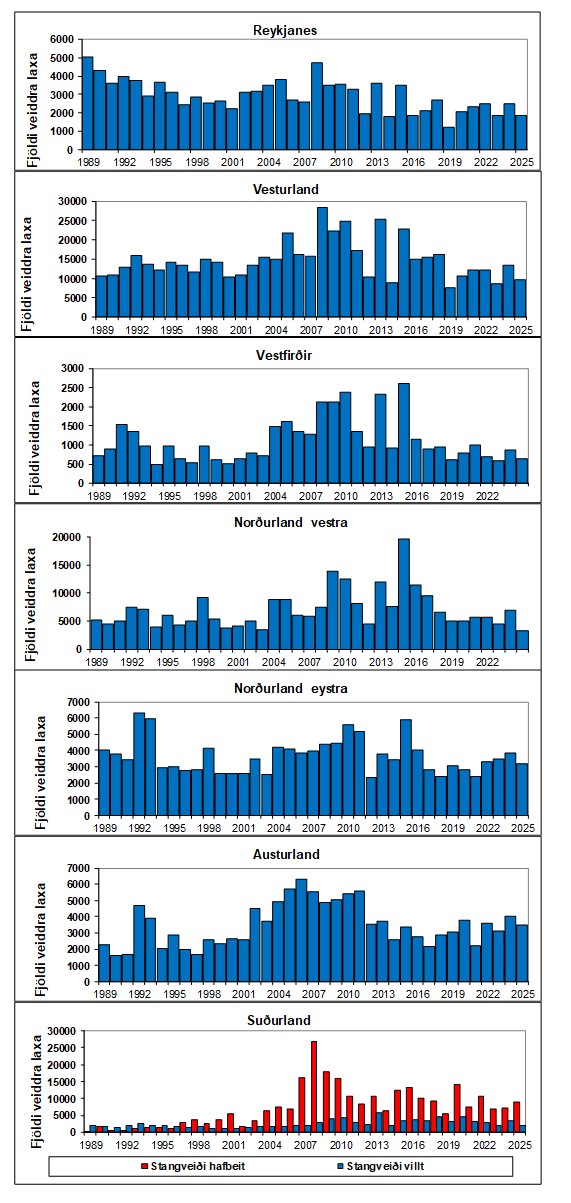Heildarfjöldi stangveiddra laxa sumarið 2025 var um 33.000 fiskar (1. mynd), sem var um 24% minni veiði en 2024 og um 20% undir meðalveiði áranna 1974-2024. Laxveiðin 2025 var um 9.500 löxum minni en árið 2024, en sambærileg við veiðina 2023. Laxveiði var minni árið 2025 en 2024 í öllum landshlutum (2. mynd).