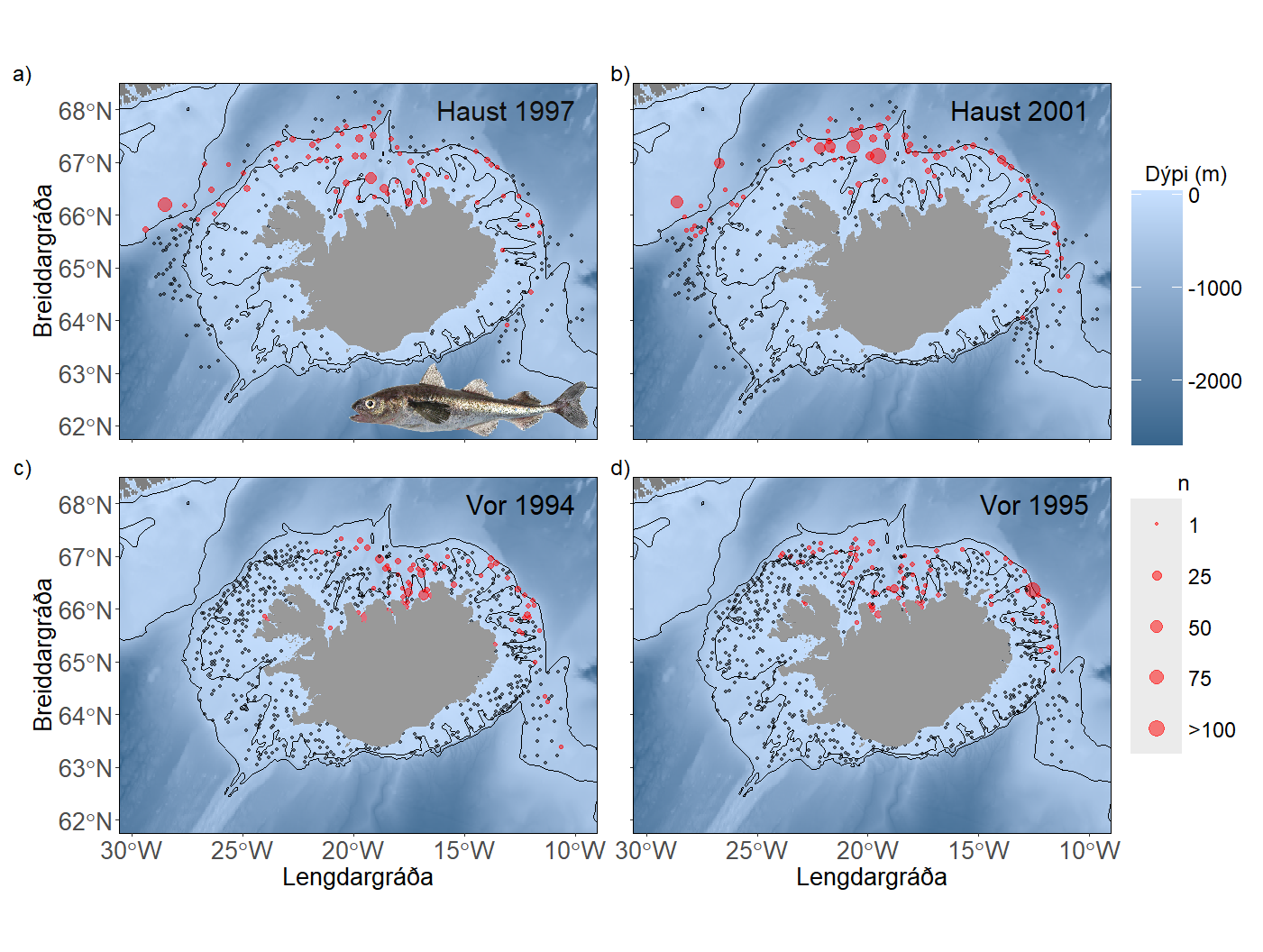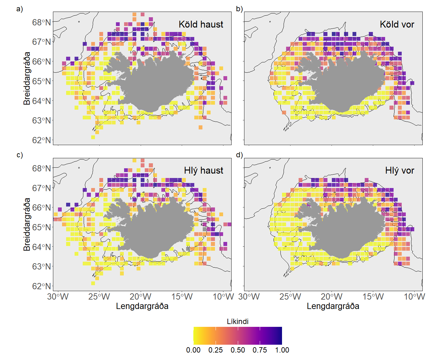 Í hlýjum árum var ískóð að finna á minna svæði og hörfaði frá grunnsævi í norðri og norðvestri í dýpri og kaldari sjó (Mynd 3). Útbreiðslubreytingar voru meiri á vorin en á haustin og gæti tengst þörfinni fyrir kaldara hitastig við hrygningu að vori. Þekking á ískóði við Ísland er enn takmörkuð, t.d. er óljóst hvort hrygning við Ísland gefi af sér nýliða og þá hvort stofninn sé sjálfbær eða hvort hann sé háður því að ungfiskur berist frá öðrum norðlægari svæðum. Hins vegar er ljóst að hlýnun hafsins í kringum Ísland minnkar búsvæði ískóðs, sem gæti haft afleiðingar fyrir afræningja á þessari tegund.
