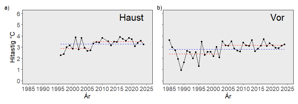 Mynd 1. Meðalhiti við botni á togstöðvum norðan og austan við Ísland í stofnmælingu botnfiska að vori og hausti.