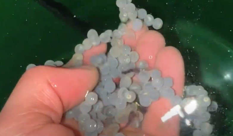 Hlýrahrogn í hrjúfum hrammi starfsmanns tilraunaeldisstöðvarinnar að Stað í Grindavík. Skjáskot úr myndbandi um hlýraeldi.