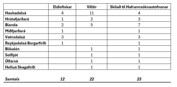 Alls hafa 23 laxar borist til Hafrannsóknastofnunar til rannsóknar og erfðagreiningar en að auki hafa 11 laxar verið sendir til erfðagreiningar en ekki verið skilað til Hafrannsóknastofnunar. Af þeim fiskum sem bárust til Hafrannsóknastofnunar reyndust 9 vera eldislaxar og 3 að auki sem ekki var skilað inn, samtals 12 staðfestir eldislaxar og 22 sem reyndust með villtan uppruna. Eldislaxarnir veiddust í Haukadalsá, Hrútafjarðará, Vatnsdalsá, Blöndu, Reykjadalsá í Borgarfirði og Miðfjarðará. Til viðbótar er eitt sýni af laxi sem veiddist í byrjun október í Ytri-Rangá, í upprunagreiningu.