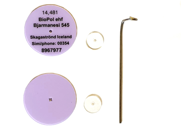 Peterson diskamerki sem notuð eru til að merkja hrognkelsi. Merkin eru utanáliggjandi en þau eru fest á bakugga hrognkelsa. |